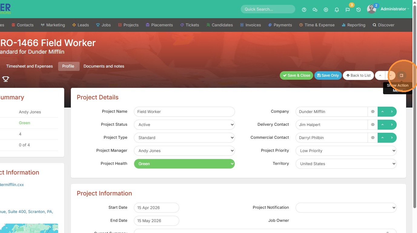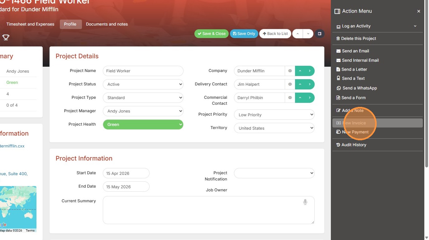 1. An invoice can be raised from a job or project/assignment record. Click on the action menu to get started.
