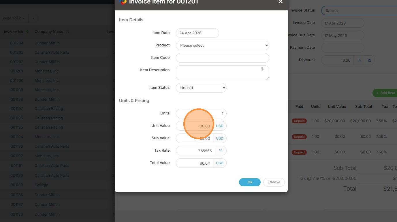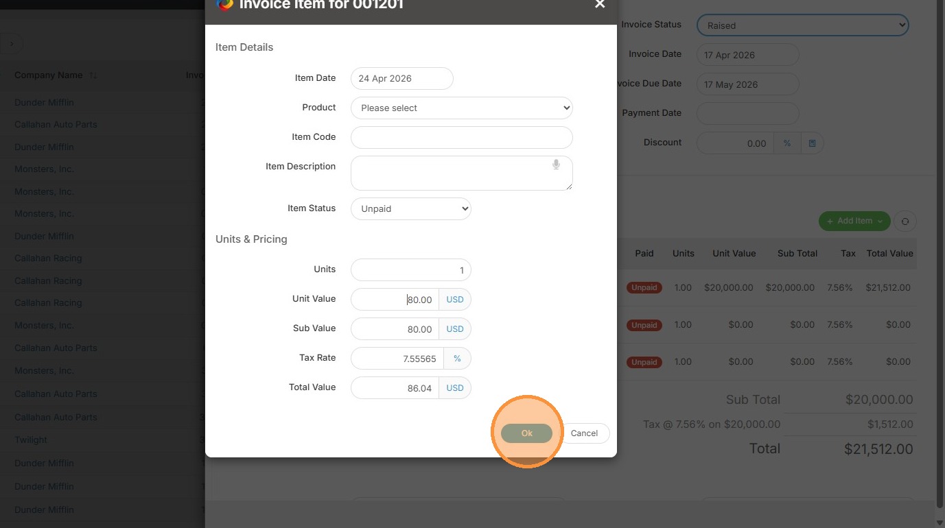 4. Select the product from the dropdown list or manually type the item details.