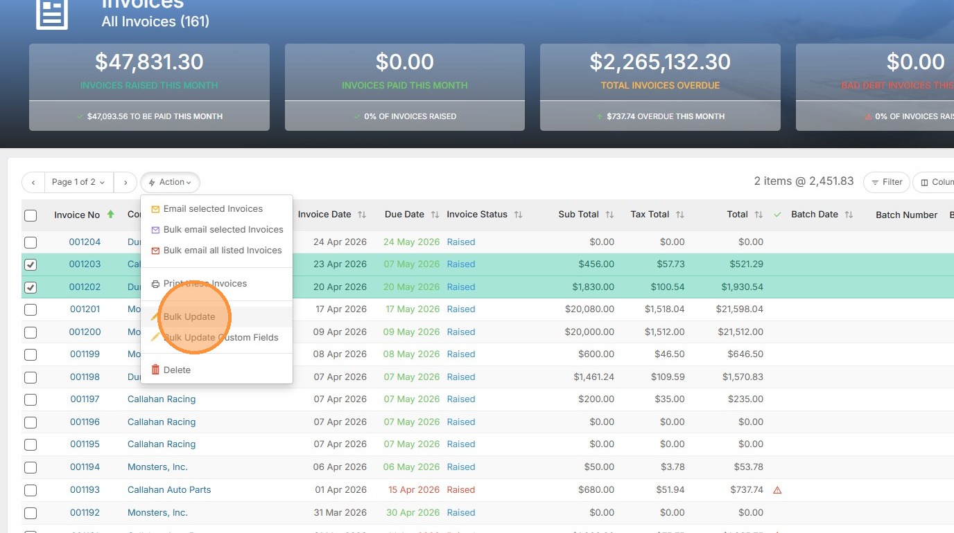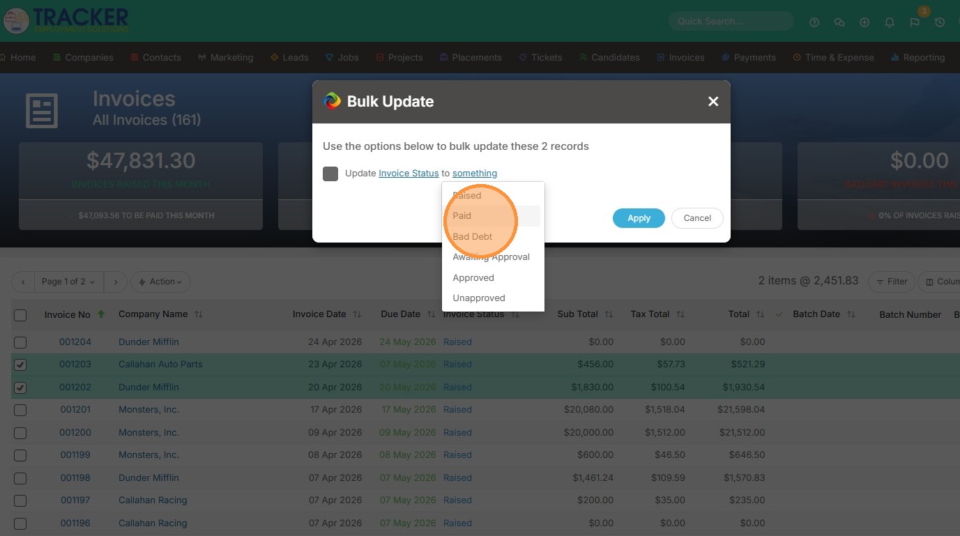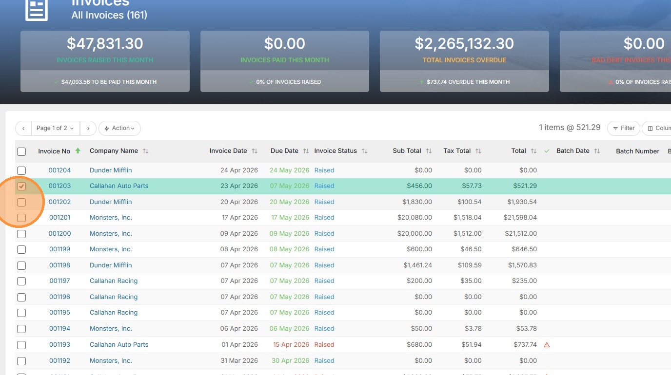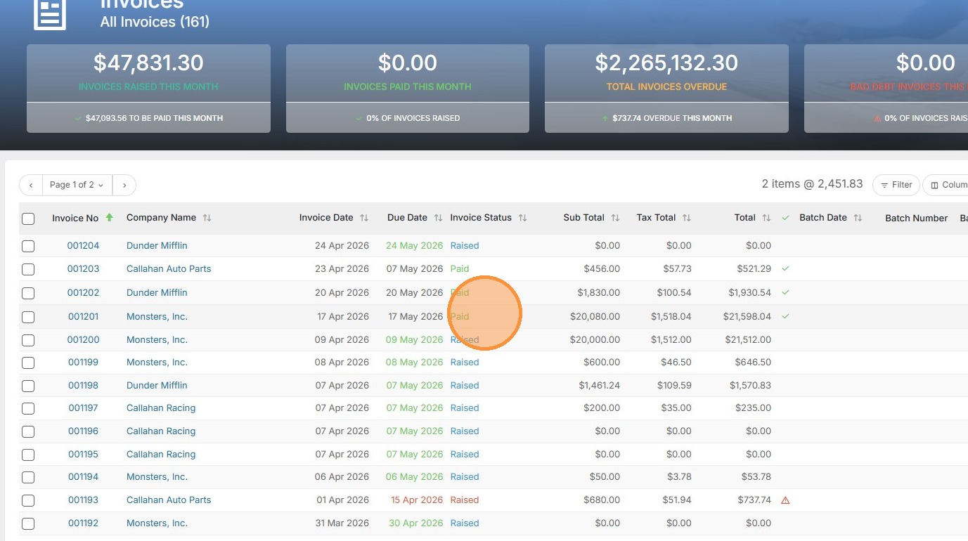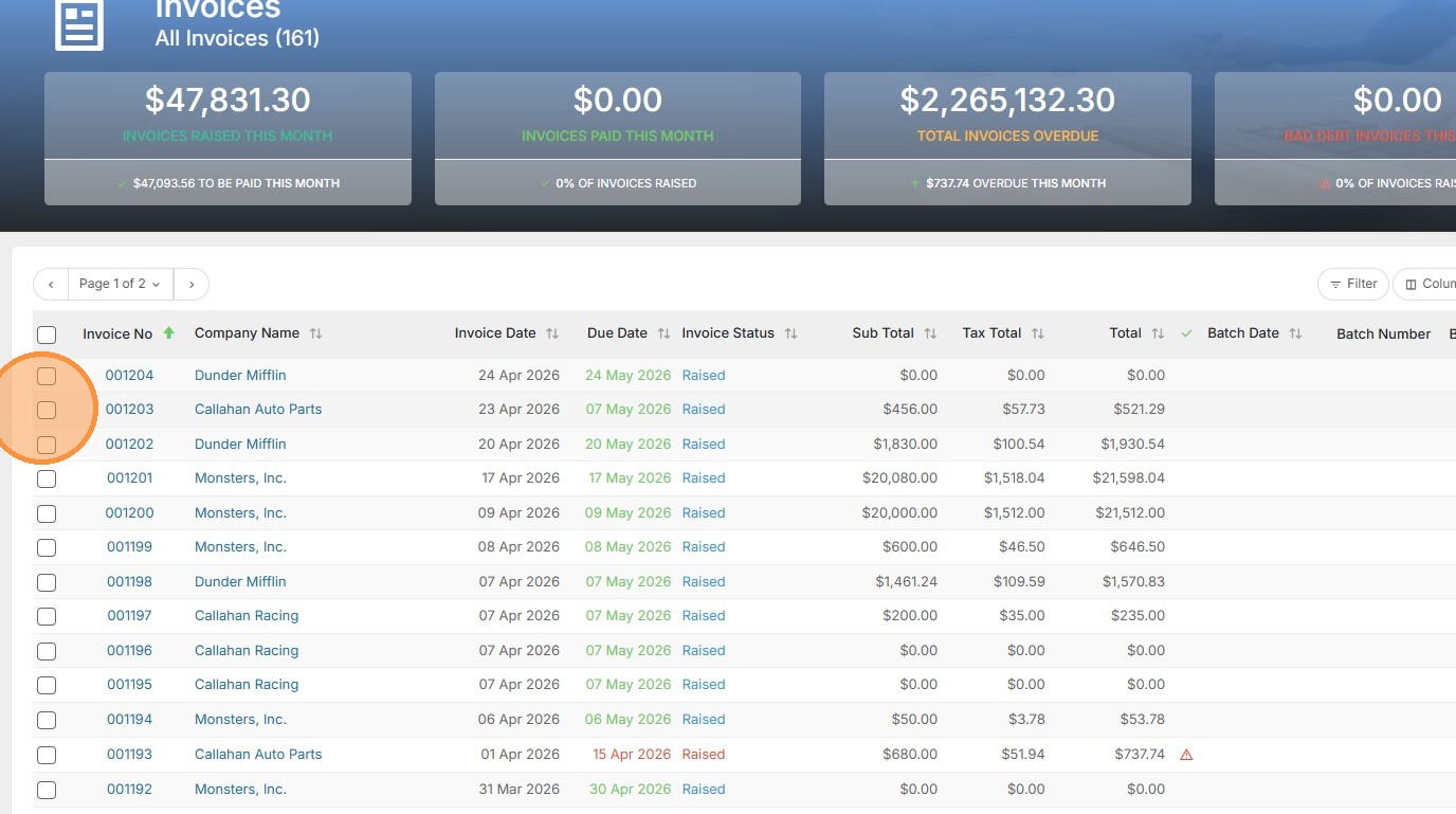 1. To mark invoices as paid in bulk, check those invoices off where the white boxes appear.