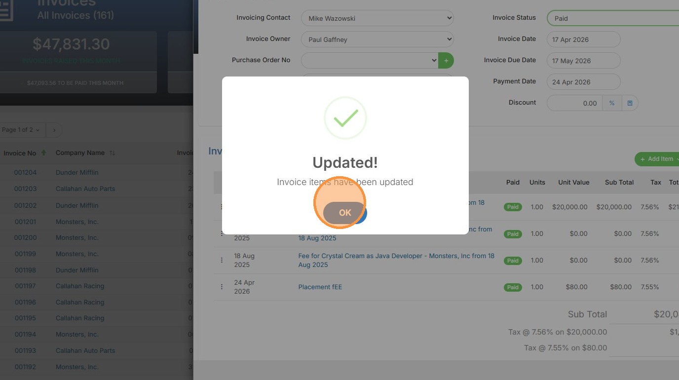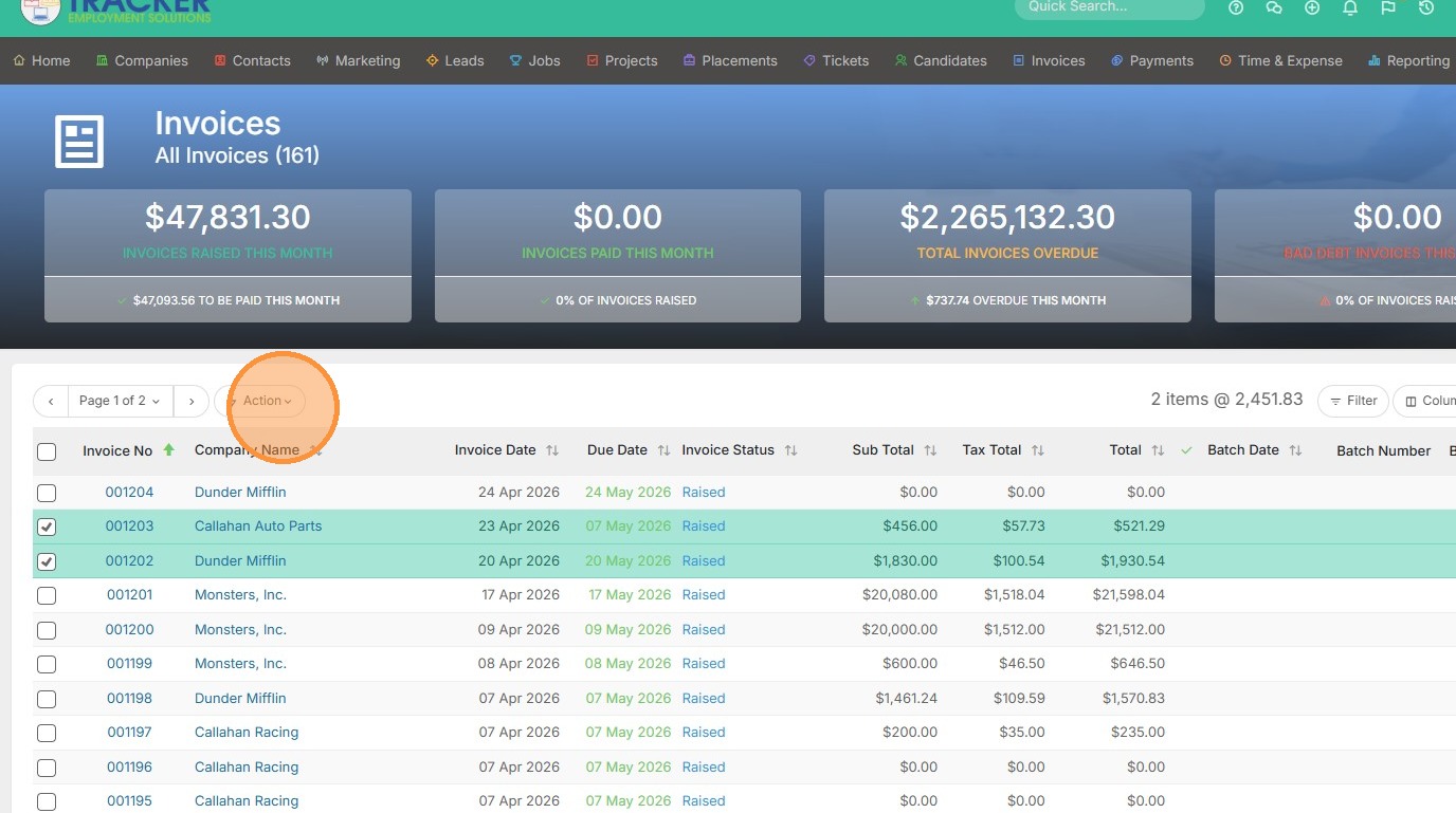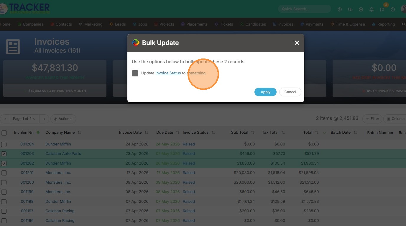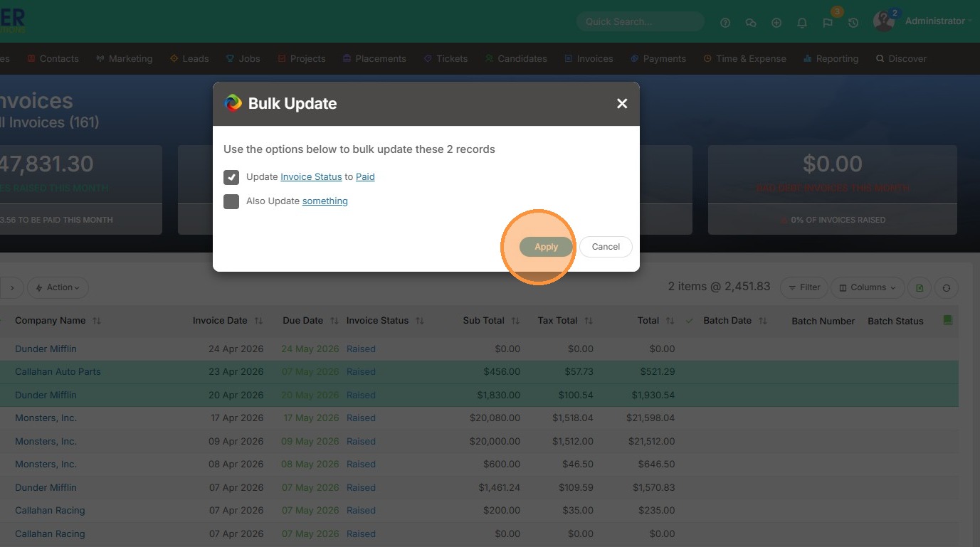 1. To mark invoices as paid in bulk, check those invoices off where the white boxes appear.