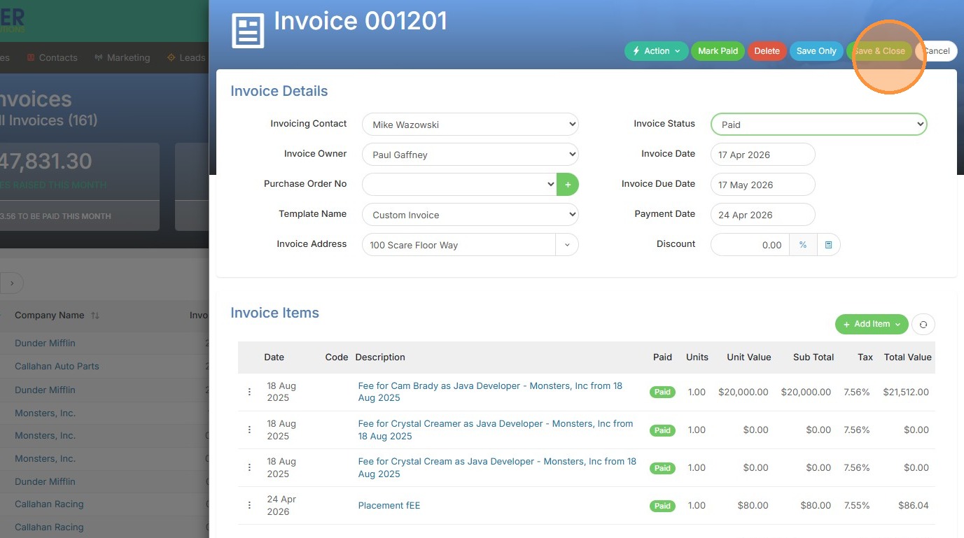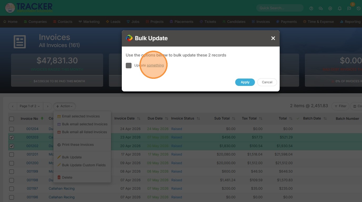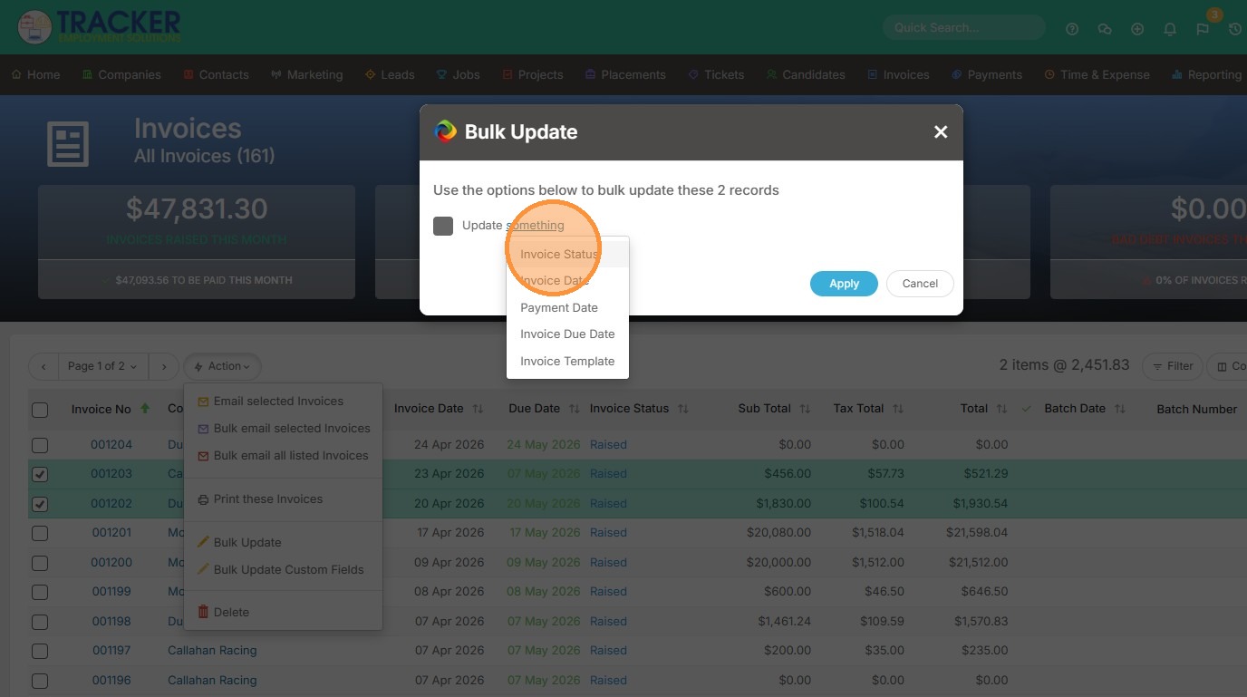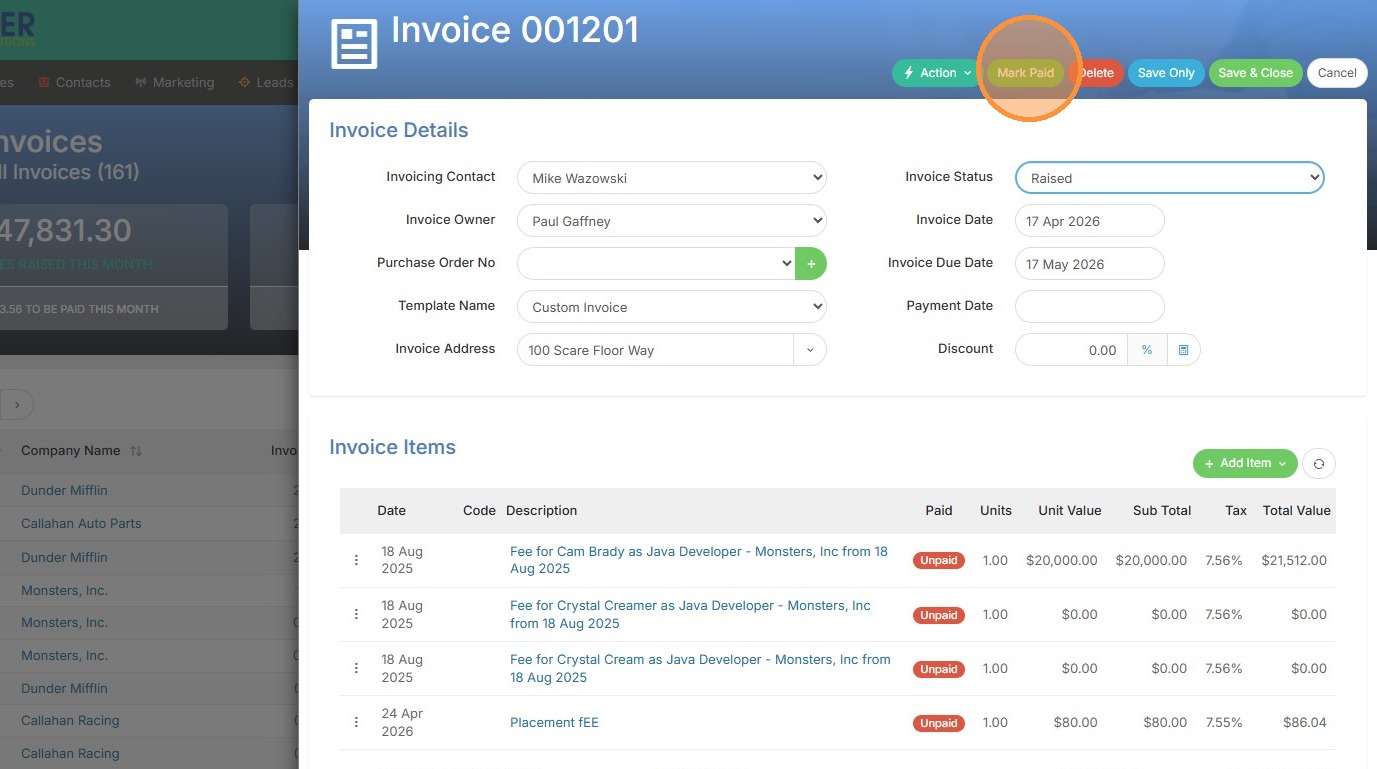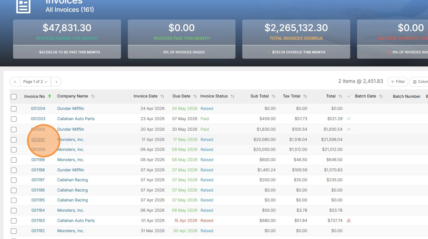 1. To mark invoices as paid in bulk, check those invoices off where the white boxes appear.