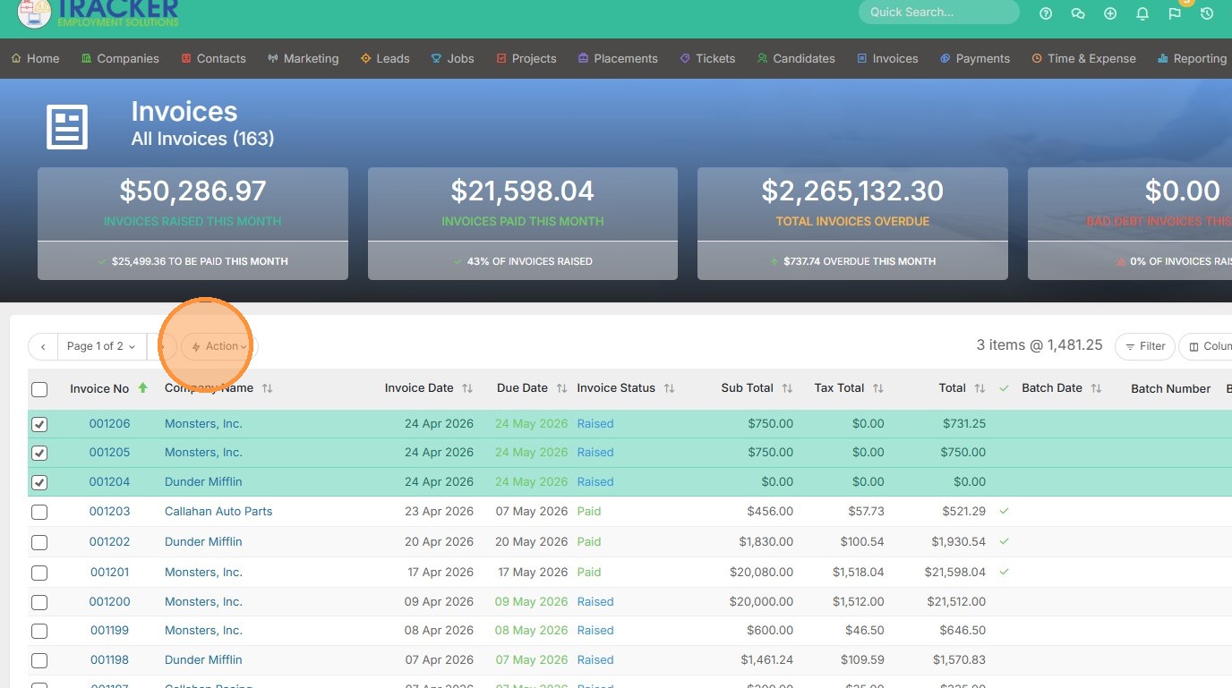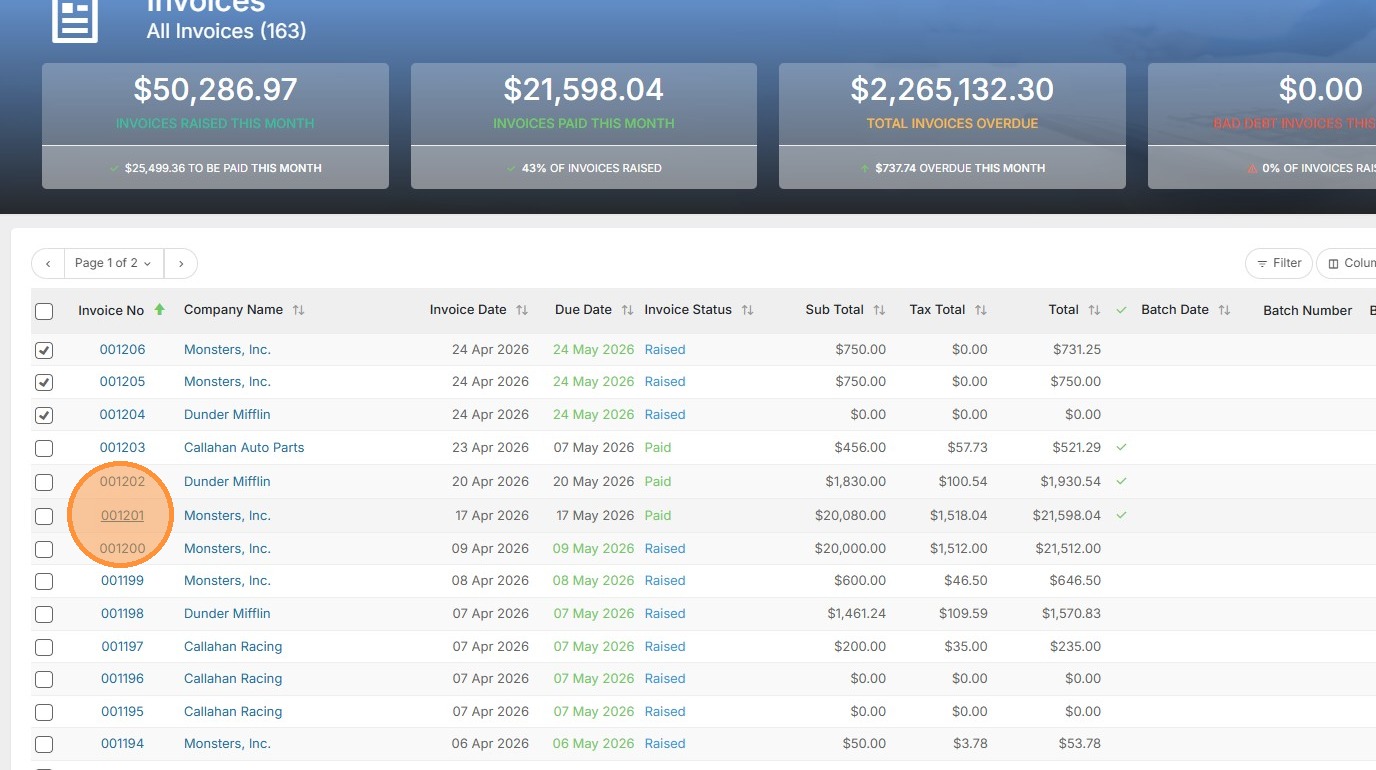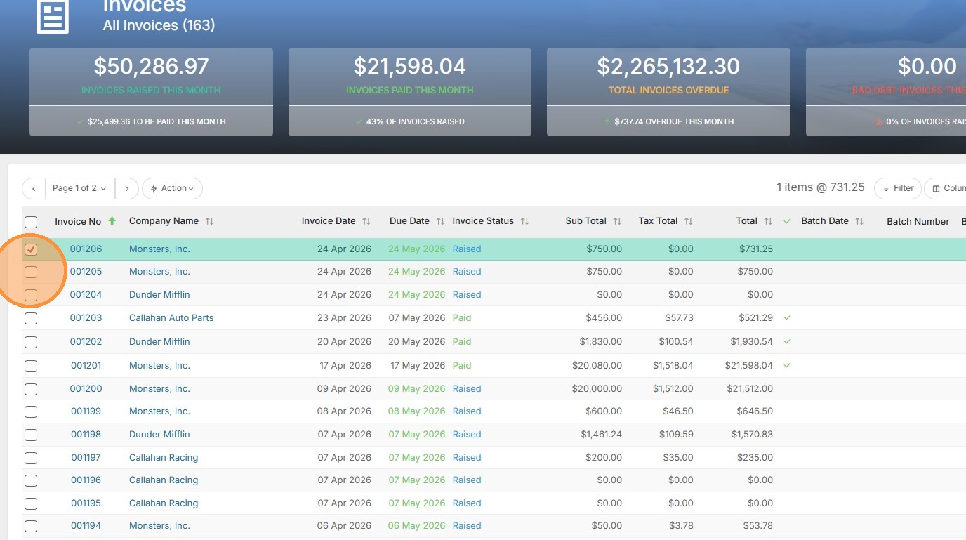 1. To email an invoice, you can do so in bulk or individually. Click on the checkboxes to select multiple.