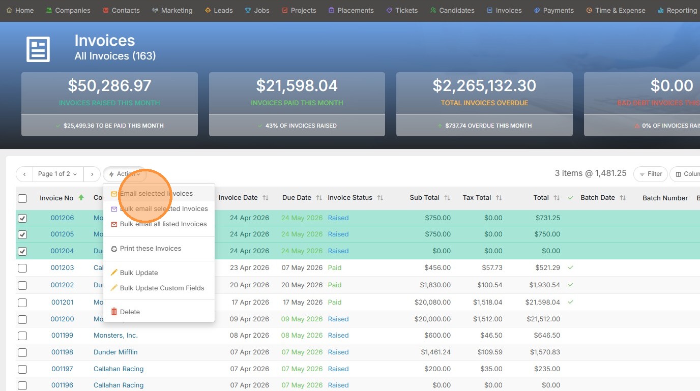 3. Click "Email selected Invoices"