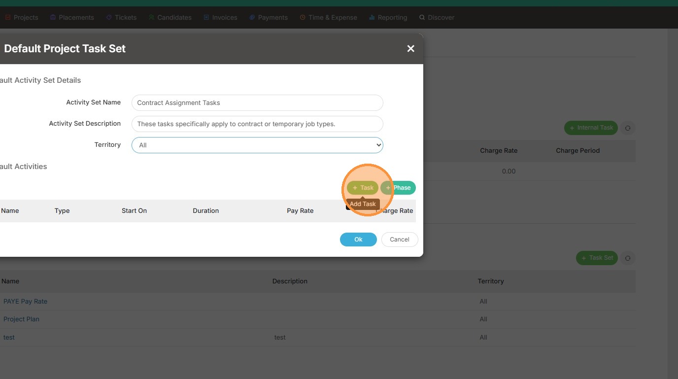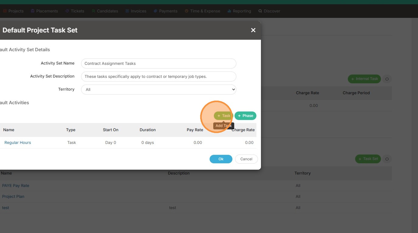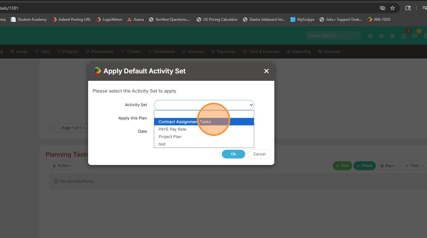 1. Within assignments, or projects, you can apply a default task set. This is done under the Planning Tasks section within the project.