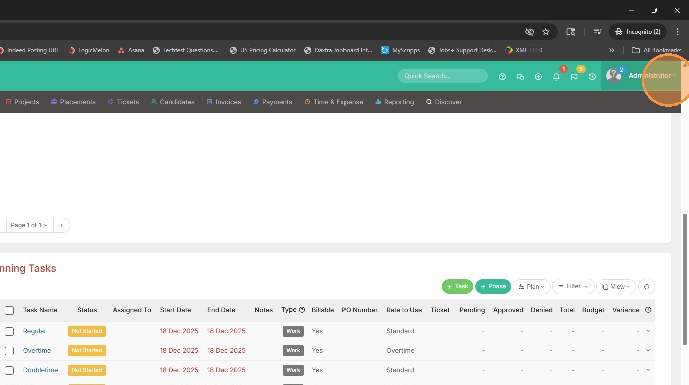 4. To add a default task set, so you have options in that Plan dropdown, click on your name at the top right corner of the screen.