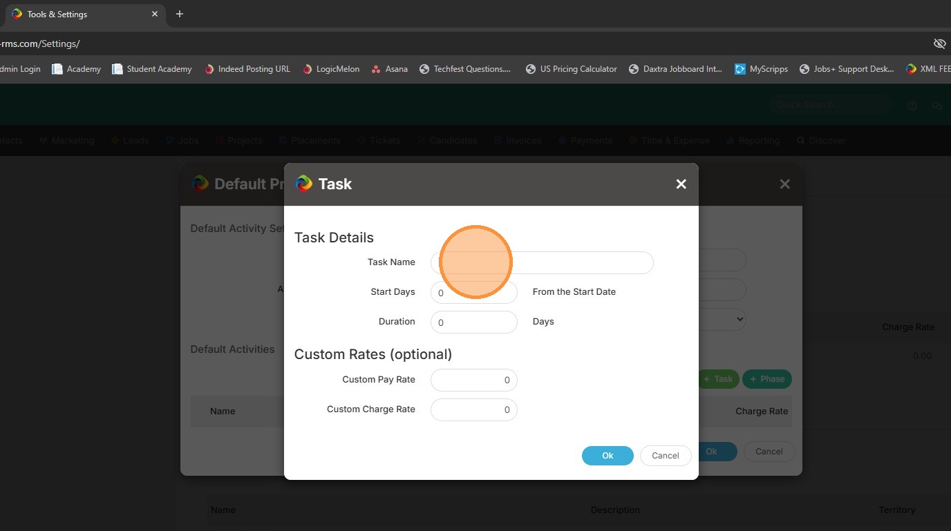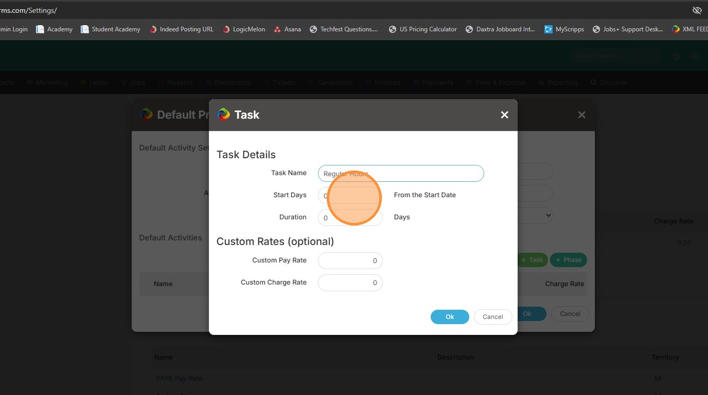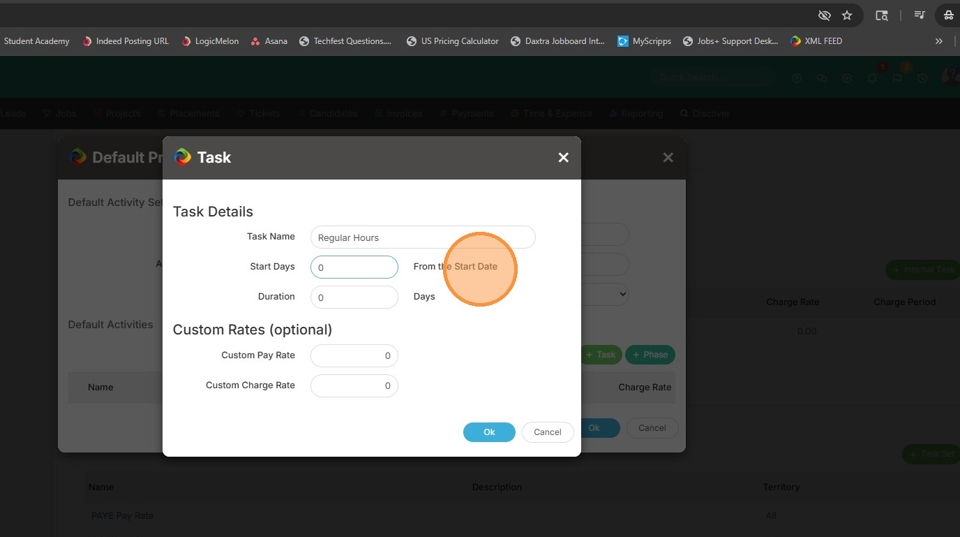 14. You can then click into Start Days and adjust the number of days if needed. If you leave this at 0 it will assume this task becomes available on the placement's start date. If you always have candidates working 2 days (for example) after their start date, you can enter the number 2, and the task won't become available until after that 2 day mark.