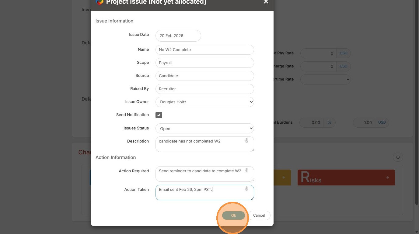3. In this example, the issue we have is for Payroll, and it's that we need the candidate to complete their W2.