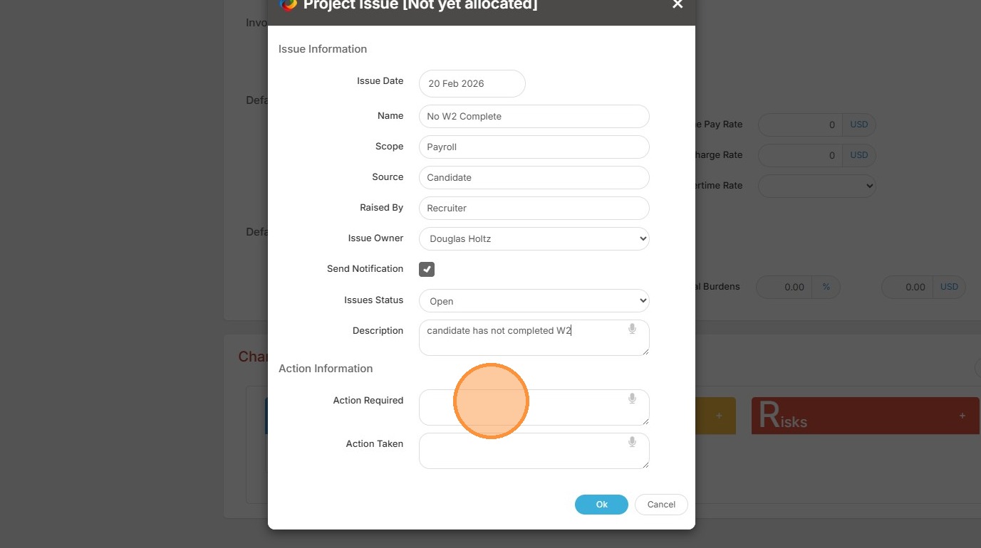 6. And the Action Taken (if it has been), and click Ok to add the Issue.