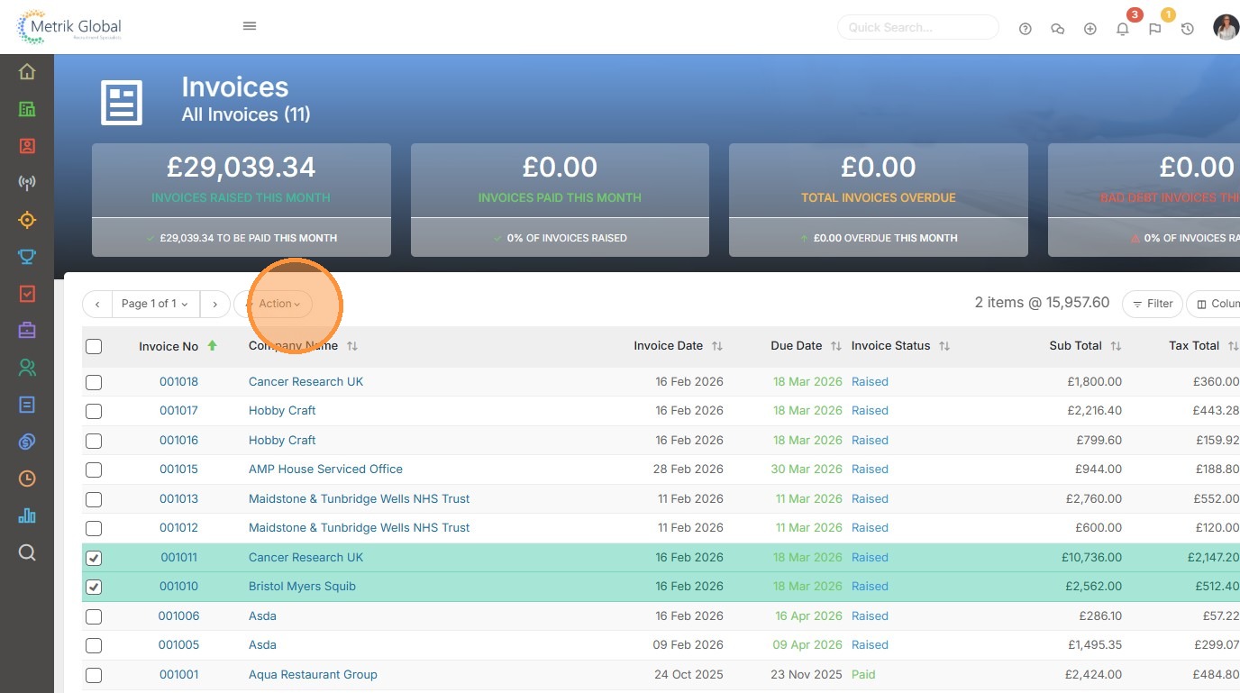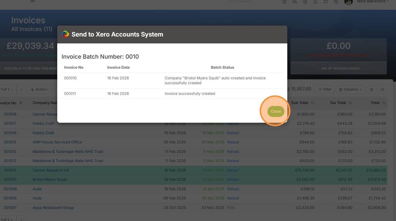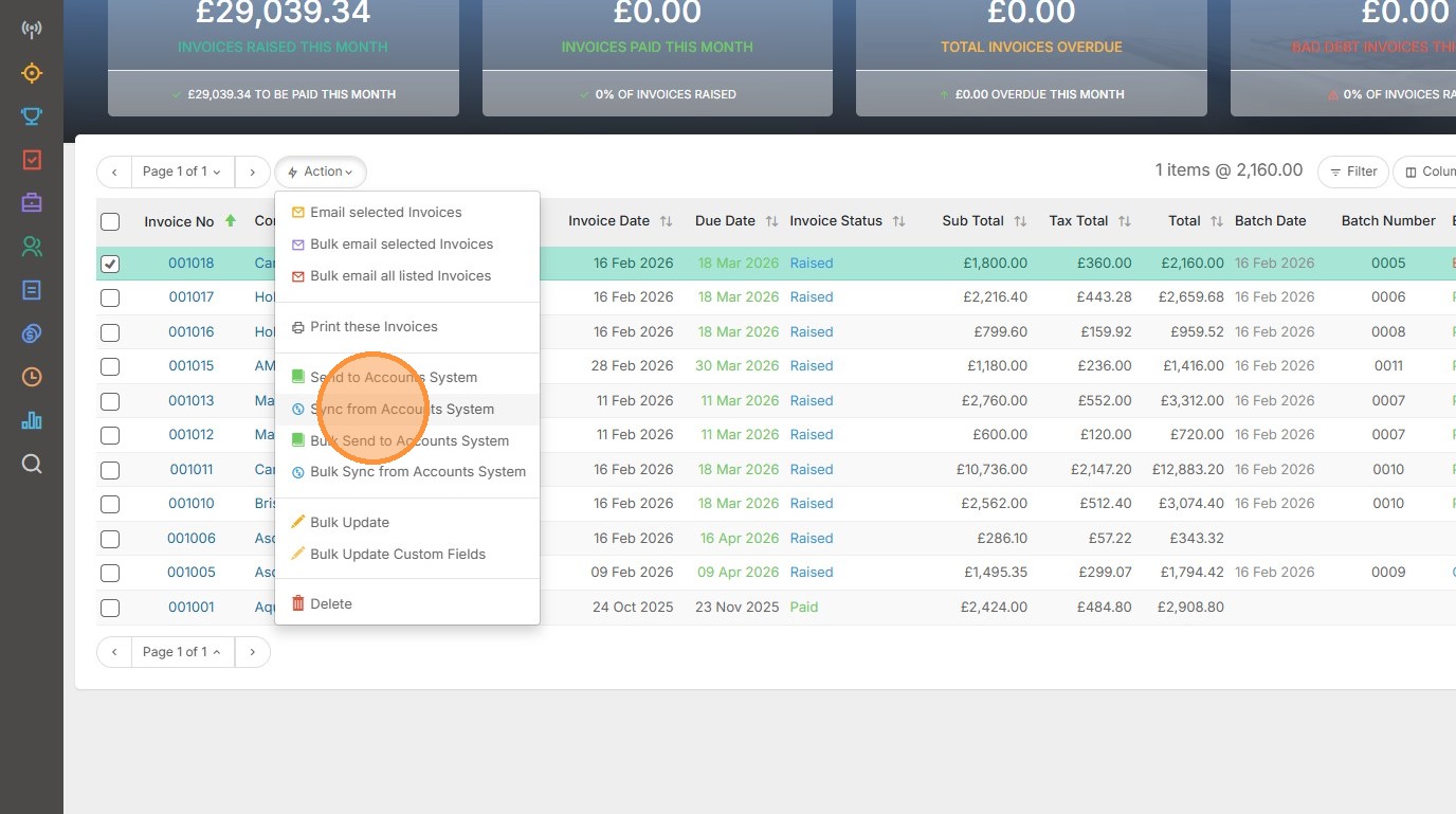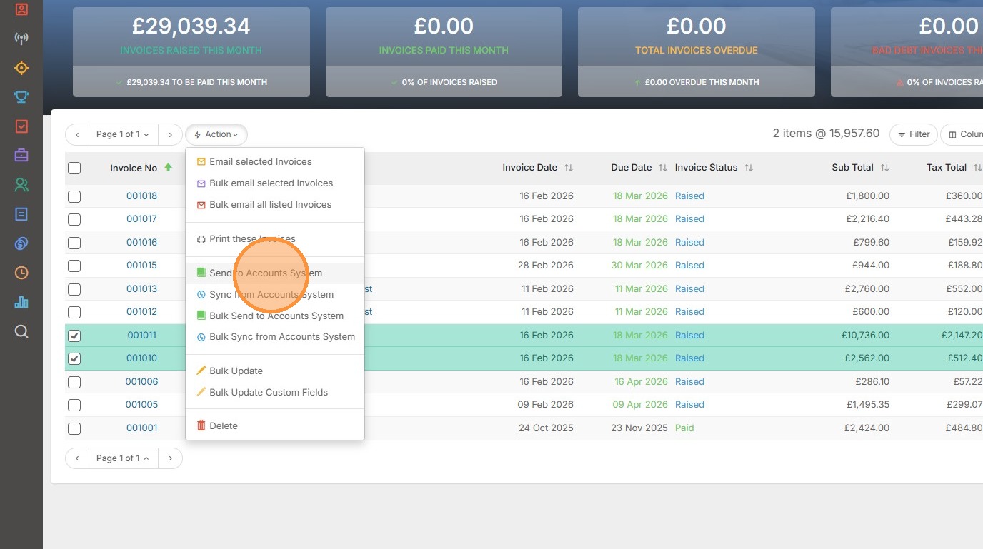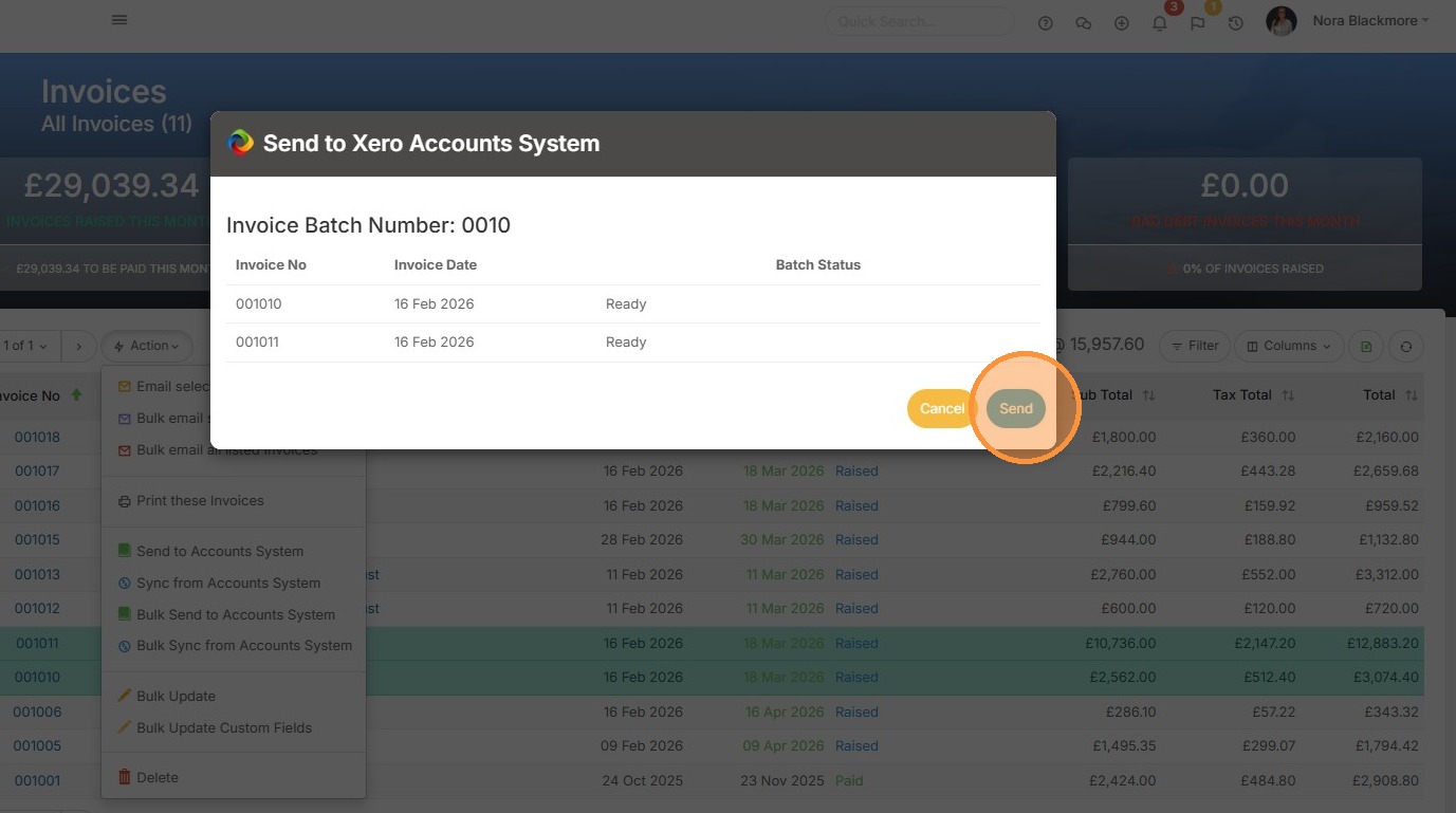 7. To send multiple Invoices to Xero we'll first tick those we want to send before clicking the Action Button.
