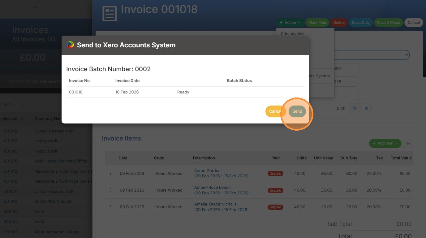 9. As with sending individual invoices we first get a pop up confirming which invoices we plan to send. Click Send to proceed.