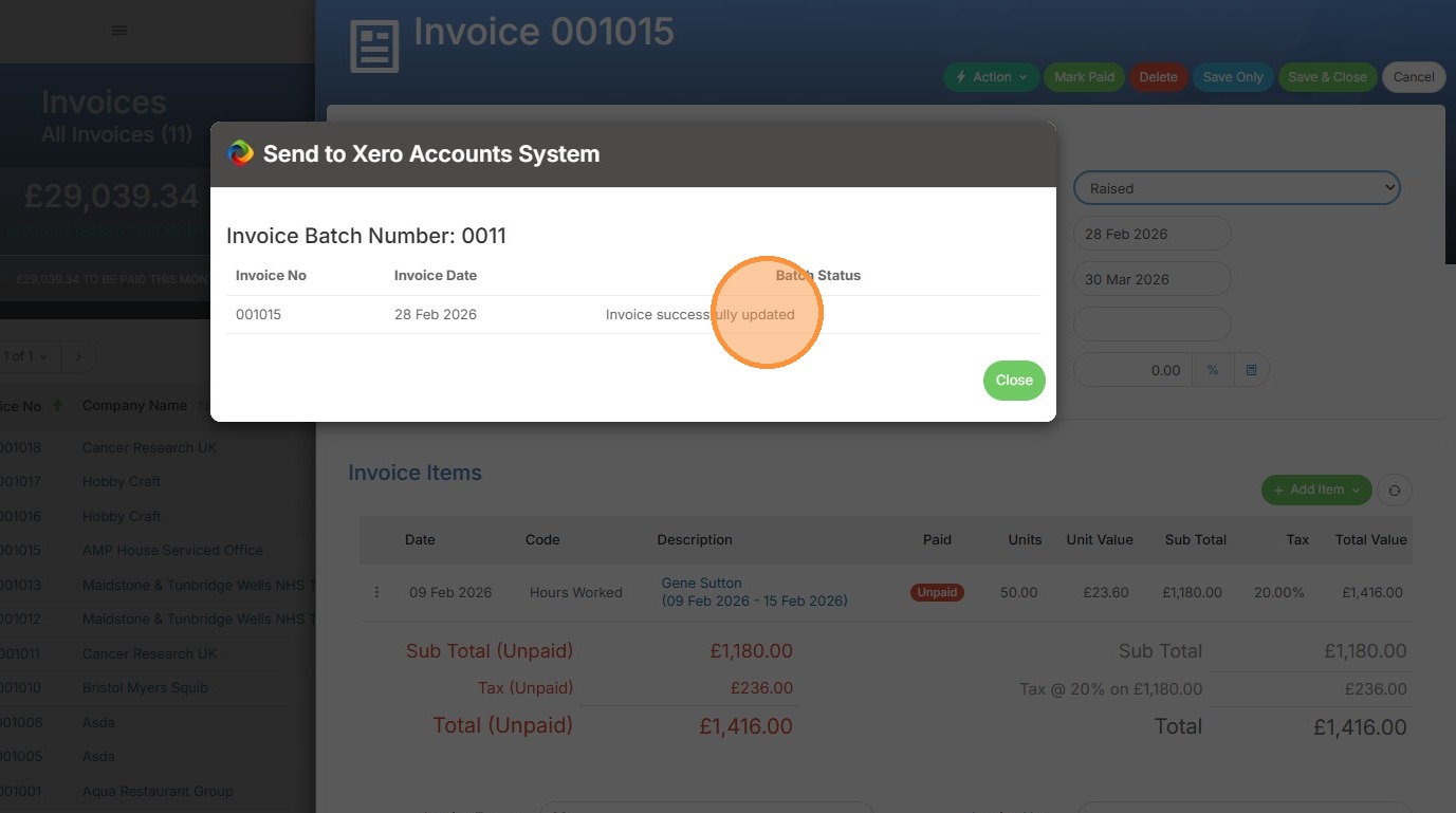 5. Next, a pop-up confirms whether the send was successful. A send may fail if, for example, the company doesn't exist in Xero and your settings prevent new companies from being created during this process.