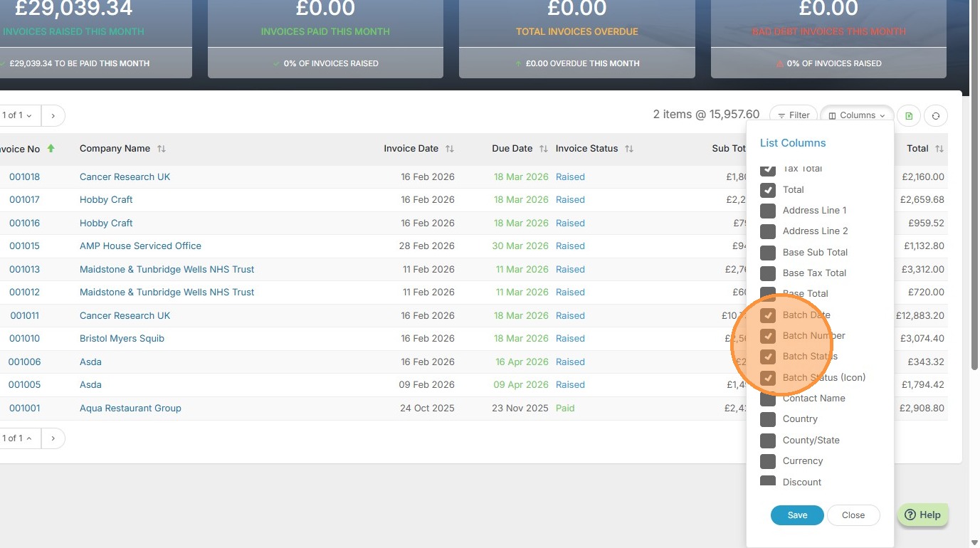 11. Back in Tracker, Invoices area there are a few columns you may wish to add to help you identify invoices that have been sent to Xero. Under the columns menu you can add columns for: Batch Date, Batch Number, Batch Status and Batch Status Icon. Remember to hit Save to add any selected columns.