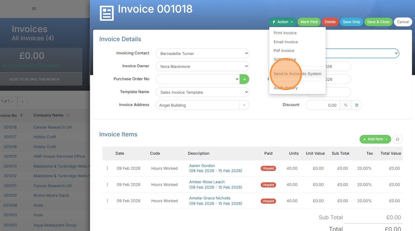 3. Under the Action Menu click "Send to Accounts System".
